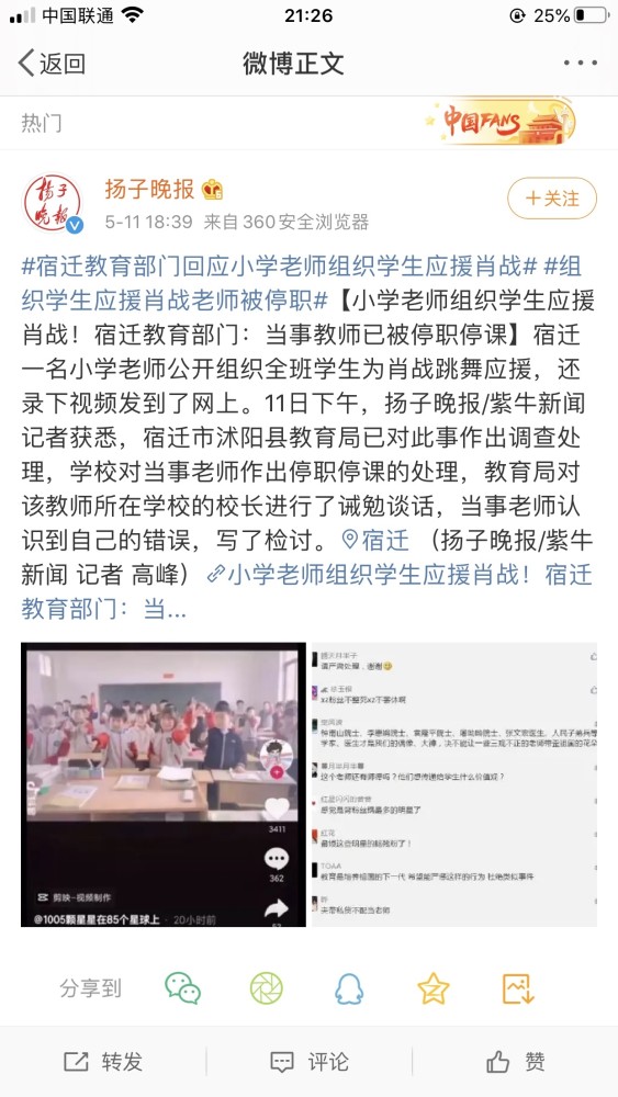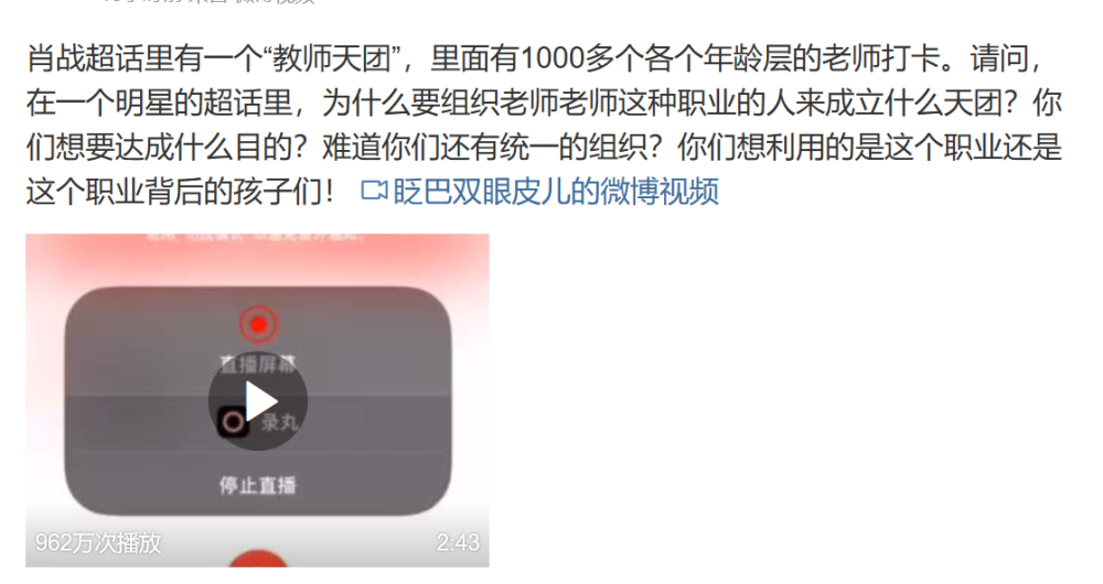 其实这件事在宿迁教育部门没有进行回应之前,肖战粉丝和工作室都点赞、评论甚至转发,而如今闹出事情了,连教育局都出面处理了,马上就把事情的责任全都推卸给这位粉丝,你却摘得干干净净,你真的在乎过你的粉丝吗,你的良心不会痛吗。躲在维护你的粉丝后面的你,就这样把你的粉丝一个一个扔掉,粉丝现在真的只是个叫做肖战的商品了。而且我也想对这位身为教师的粉丝说,你知道教师的德行远比学识重要吗?更何况你是一位小学老师,对一个小孩的启蒙和影响有多大。追星追到课堂上,天天教学生打榜应援,孩子长大后如果过得不好,你就背上一辈子的骂名,孩子父母永远记得有这么个老师从小学就开始教孩子追星!不是说追星不正确,而是希望你不要把追星的狂热劲头带到课堂上,教育事业应该是严肃和神圣的,而不是嬉戏和胡闹。