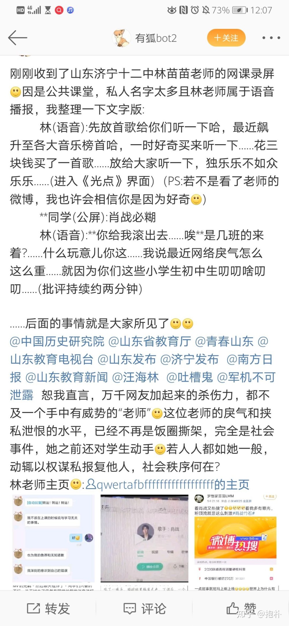 肖战粉以教师身份,让学生给其应援。这一条新闻微博热搜了,点开热搜里面的新闻,里面到处都是肖战粉丝控评,整齐划一跟喊口号似的,把肖战摘得干干净净。肖战粉丝裹挟民意,我们根本看不到普通人的评论,他家粉丝传统技能了,要么就是通过举报让你闭嘴,要么就是通过更大的声音盖过你,让我们这一点点人说的话无法被听见。但是总有人会选择站出来去指责这种追星风气,虽然被肖战粉骂得很惨,但我真的很佩服。