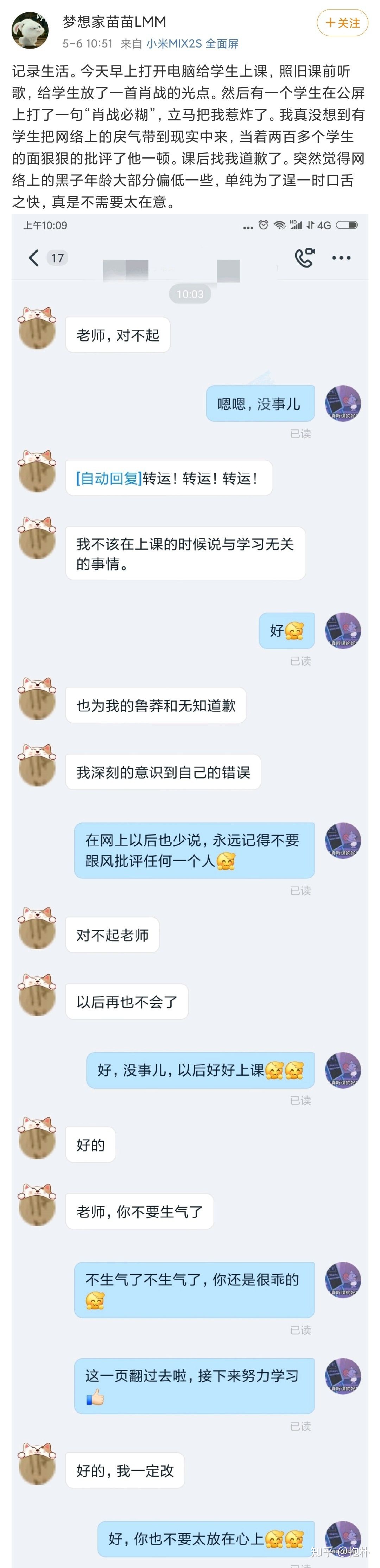 还有一个更迷惑的行为,有学生只喊了一句肖战必糊,就在200多人的讲堂上,训斥学生,我不知这位老师在课堂上发了多大的火,聊天记录里满是这位学生的小心翼翼。