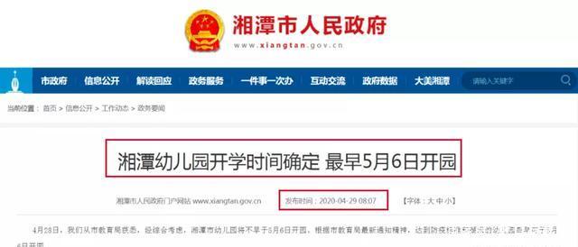 湖南:5 月 15 日前全部开学。按属地管理原则,5 月 11 日起,经审核通过后的幼儿园开学,所有幼儿园在 5 月 15 日前完成开学。长沙市幼儿园大班5月11日开学,全市幼儿园在5月15日前完成开学。株洲市幼儿园5月7日起开学;湘潭、常德、湘西、岳阳等市幼儿园5月6日开学。