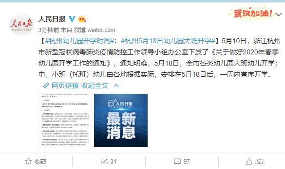 浙江:舟山市经教育局审核同意的幼儿园于5月6日开始开学;宁波市、丽水市符合开园条件的幼儿园5月11日起陆续开学。杭州市5月10日发布通知明确,5月18日全市幼儿园大班幼儿开学;中、小班(托班)幼儿安排在5月18日后,一周内有序开学。