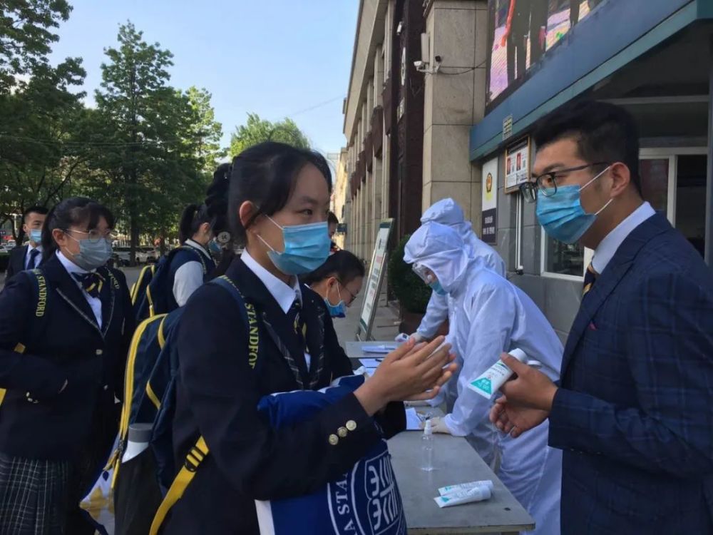 温暖的阳光,照亮这场期盼已久的见面。“同学们,欢迎回校,保持好1米间距分批次进入……”早上7点30分,华夏斯坦福学校初中部校长王晓斐、副校长张振带领初一、初二全体教师、安保人员早早地守候在各自点位,迎接学生。同学们背着书包,佩戴口罩,身着整洁的校服,严格按照防控要求依次排队接受体温检测,进入校园,秩序俨然。