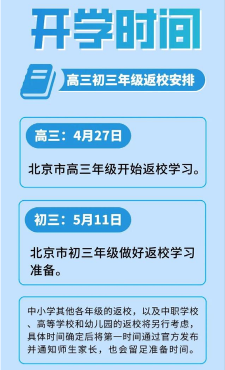 4月12日,北京正式宣布了开学时间,高三4月27日开学,初三年级5月11日开学,截止目前除了湖北省之外全国各省市已经明确开学时间。