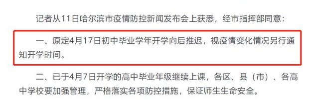 除了以上三地,原本已经宣布4月17日初三开学的哈尔滨也突然宣布开学延期。