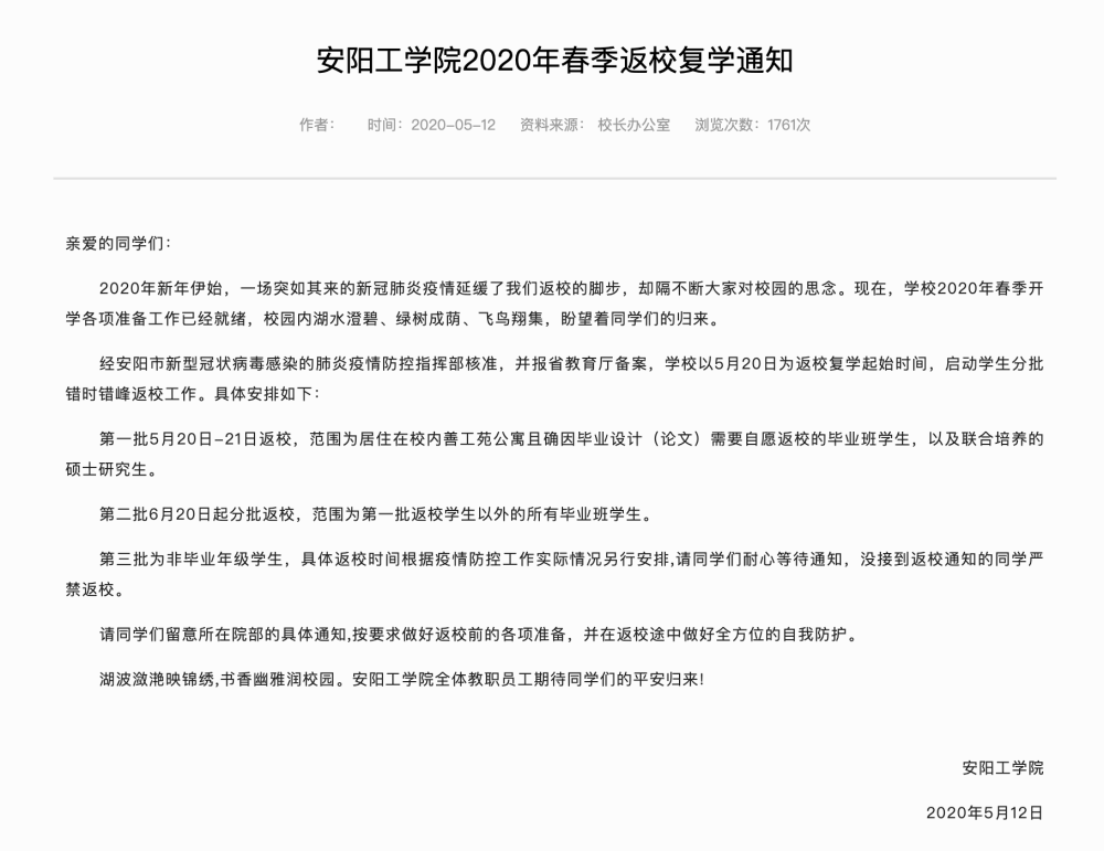 安阳工学院开学时间定了!,学校以5月20日为返校复学起始时间,启动学生分批错时错峰返校工作。