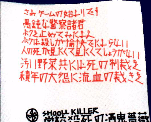 1997年,日本14岁少年杀害两名小学生,他在给警察的信中写道:我享受杀人的乐趣,并自称“酒鬼蔷薇”,媒体称之为“少年A”。