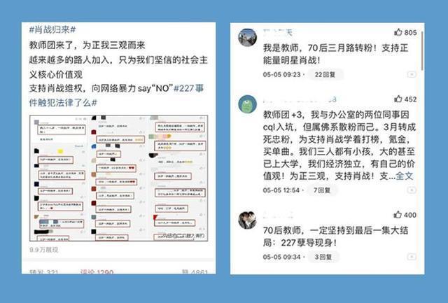 该网友声称,“教师团来了,为正我三观而来。越来越多的路人加入,只为我们坚信的社会主义核心价值观。支持肖战维权,向网络暴力say No”。
