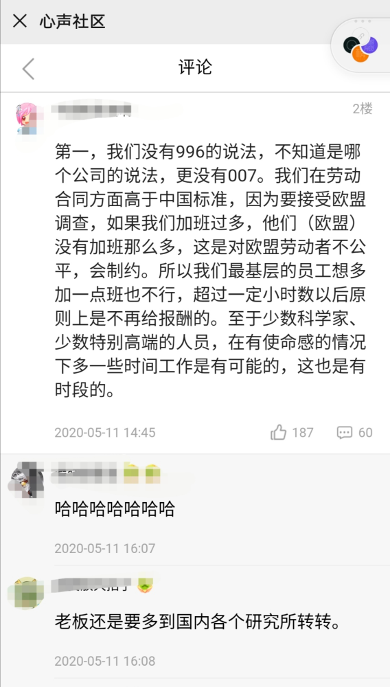 对此,有华为员工在内部员工平台心声社区,表达了不同看法:“老板还是要多到国内各个研究所转转。”