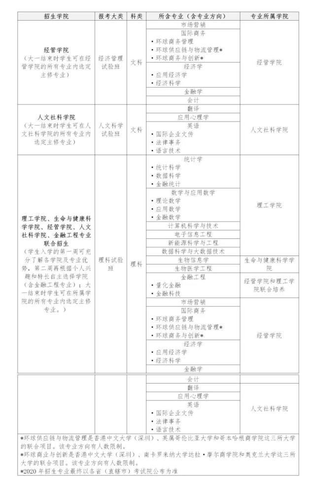 2.理科学生报考时只需填报理科试验班。本试验班为经管学院、理工学院、人文社科学院、生命与健康科学学院及金融工程专业等所有学院(专业)联合招生,学生入学的第一周可充分了解各学院及专业优势,第二周再根据个人兴趣和特长自主选择学院(含金融工程专业);大一结束时学生可在所属学院的所有专业内选定主修专业。详见下表: