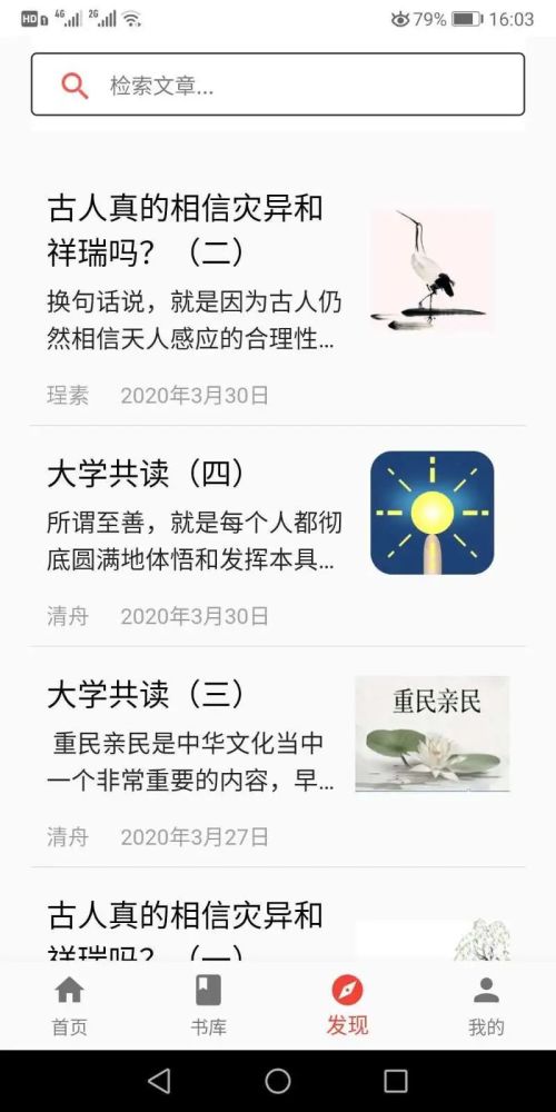 二是陪伴学习。在本软件中的发现栏中,会从文史常识、经典解读、个人创作等角度选取和发表各类有关中华优秀传统文化学习的文章和音视频,以陪伴用户共同学习。
