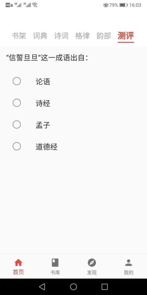 三是学习巩固与评测。本软件设有测评栏目,其中包含各类有关中华优秀传统文化的知识测试题,以帮助用户检验自己对传统文化的了解情况,从而促进其今后的学习。同时,无论用户是否能正确回答这些测试题,最终都将得到正确答案。这无疑也是一种互动的学习方式。
