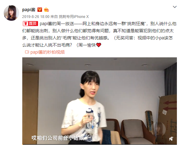 但“集美貌与才华于一身”的papi酱怎么会在意这些闲言碎语呢?papi酱的回应,则是置顶了自己的往期作品“挑刺狂魔”。
