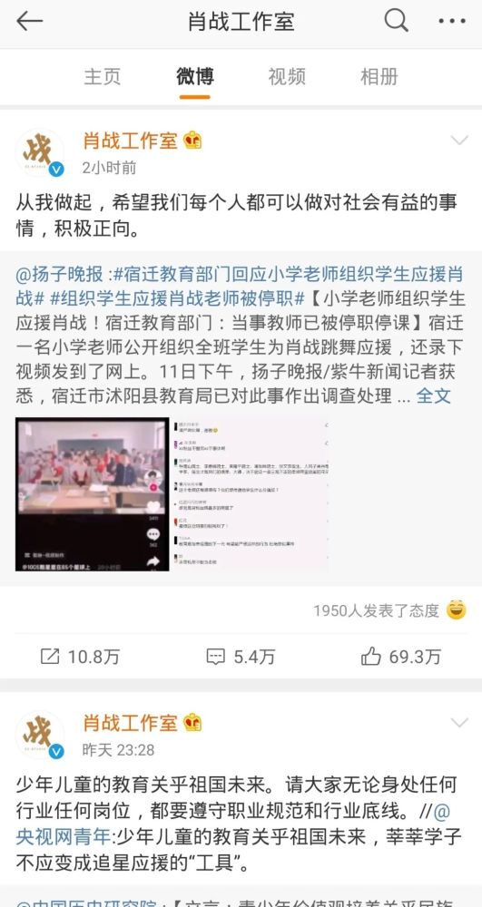 5月10日,有网友挂出了一段宿迁市某校老师带领学生为肖战应援的视频,引发大批网友声讨。据报道,视频中的孩子们整齐地做手势,跳着肖战歌曲的舞蹈,并喊着:“肖战哥哥你很好,我们很喜欢,冲啊!” 5月11日,沭阳县教育局作出处理,当事老师被停职停课,校长被诫勉谈话。