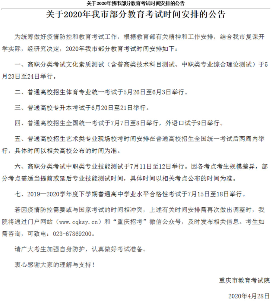 4月28日,重庆市教育考试院发布《关于2020年我市部分教育考试时间安排的公告》。公告中表示,为统筹做好防控和教育考试工作,根据教育部有关工作安排,结合复课开学实际情况,经研究讨论决定明确2020年重庆市部分教育考试时间。