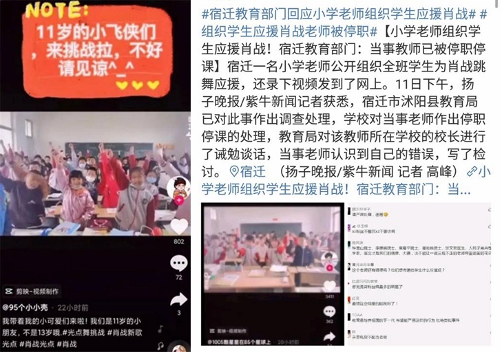 宿迁一名小学老师公开组织全班学生为偶像明星肖战跳舞应援,还录下视频发到了网上。随后,当地教育局对该校校长进行了诫勉谈话,学校对当事老师作出停职停课处理,涉事老师也写了检讨信。