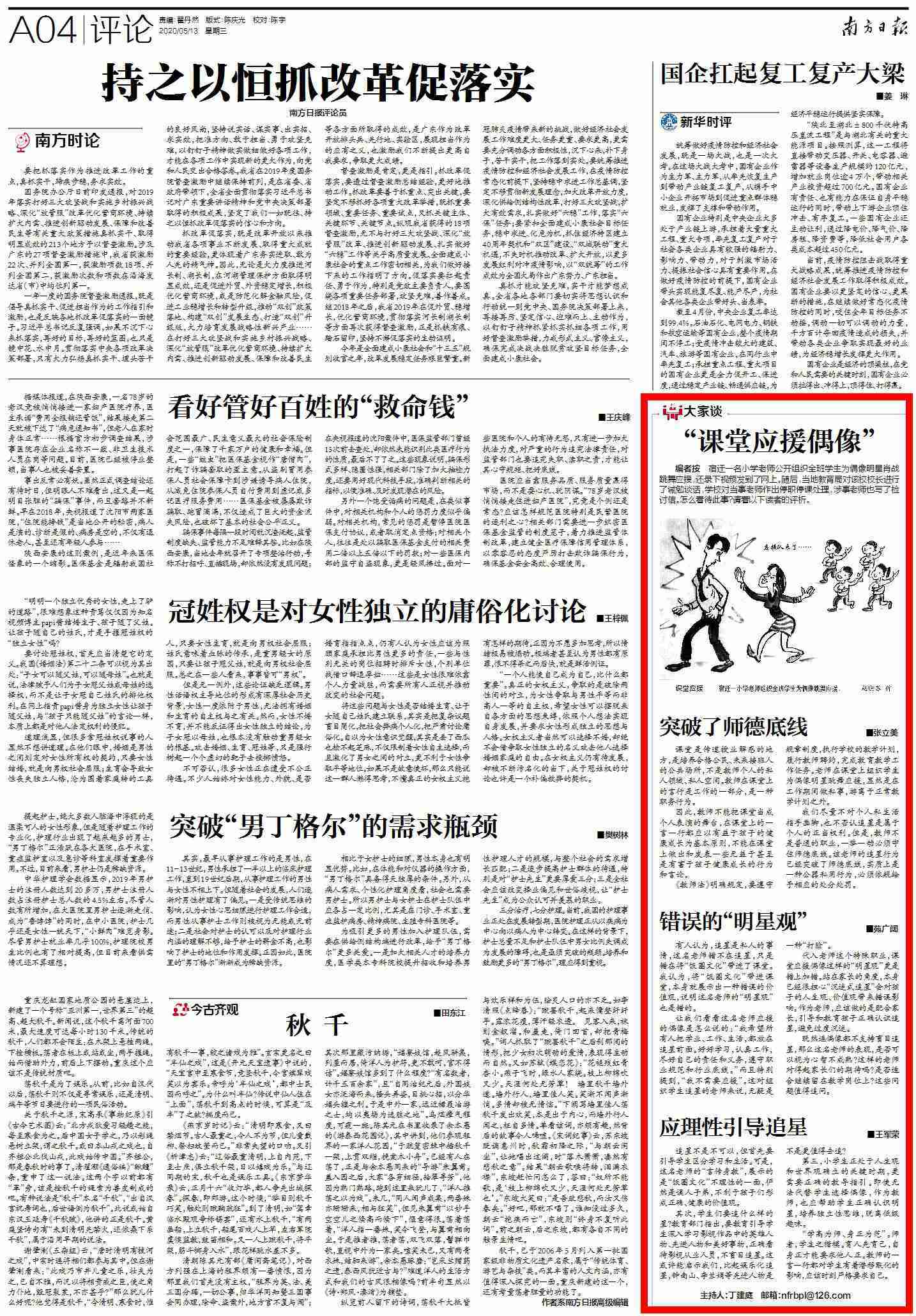 有人认为,追星是私人的事情,这名老师错不在追星,只是错在将“饭圈文化”带进了课堂。我认为,将“饭圈文化”带进课堂,本身就展示出一种错误的价值观,说明这名老师的“明星观”也是错的。