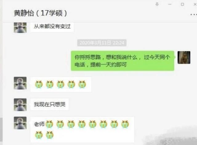 据澎湃新闻报道,近日, 有中国传媒大学26岁女研究生黄静怡家属的网友微博发文称,黄静怡被导师薛燕平刁难,毕业论文难通过,致其精神崩溃选择坠楼轻生。此事件在网上持续发酵,5月12日,导师薛燕平在个人公众号发文表示,网上流传的聊天记录为"断章取义",并公布了自己与黄静怡的完整聊天记录。