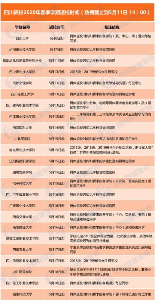 截止到5月11日,四川已有24所高校宣布返校时间: