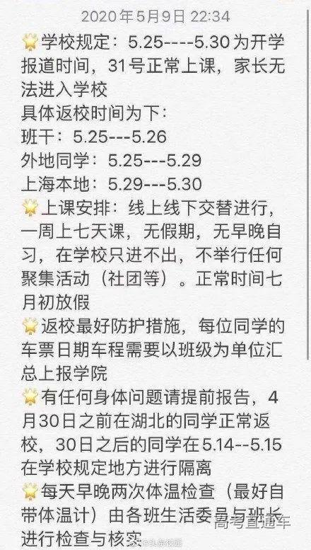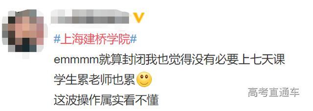 5月10日,有网友爆料称上海建桥学院部分班级已召开线上班会,有辅导员通知学生,非毕业年级学生实行分批返校,返校后不得离校,6月1日开始上课,一周七天课,线上线下交替进行,且无假期。