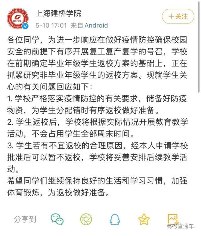 上海建桥学院在其官微上正式发出一则回应,回应对象是未返校学生。这份声明称:
