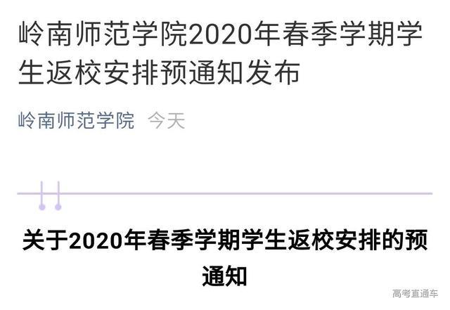 5月10日,岭南师范学院发布《2020年春季学期学生返校安排预通知》。预通知表示,5月21日起,安排大三、大四学生分批返校,其他年级学生暂不返校,继续进行线上学习,返校时间另行通知。
