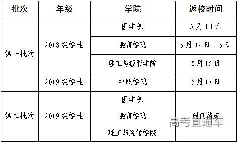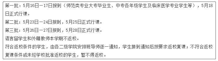 第一批次:5月18日当天返校报到;境外学生暂不返校。