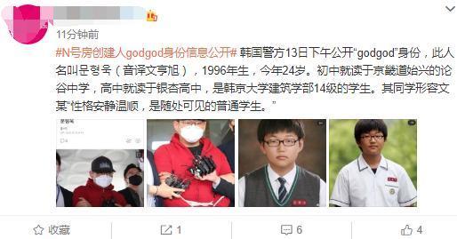 该账号称韩国警方公开了N号房创始人 "godgod"身份,此人名叫文亨旭,竟是一名90后,出生于96年,今年24岁。是韩京大学建筑学部14级的学生。其同学形容文某"性格安静温顺,是随处可见的普通男学生。"