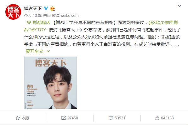 面对这些网络争议,肖战在接受《博客天下》杂志专访时表示,要学会与不同的声音相处。看来这次的事情对肖战本身来说也是一种成长,只有经历过一些逆境,才能会成长为更好的自己,这也意味着肖战将在2020年以全新的姿态出发。