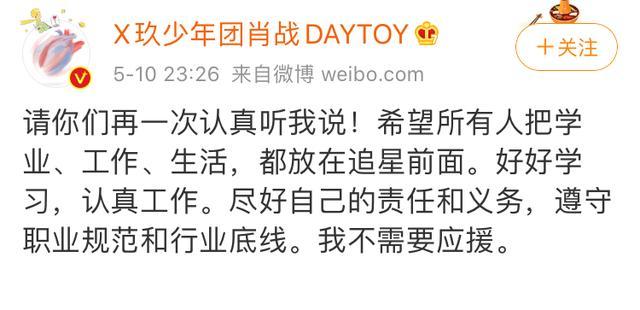 5月10日,肖战在自己的微博上发文,表示希望他的粉丝可以做自己应该做的事,把重心放在学习、生活和工作上面,一定要很用心地去生活,理性追星,并倡导一定要尽好自己的责任和义务,努力遵守好自己的职业规范和道德底线。并表示自己并"不需要应援"。