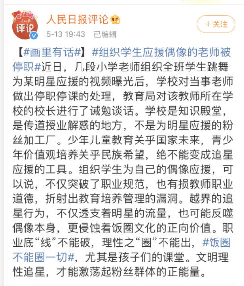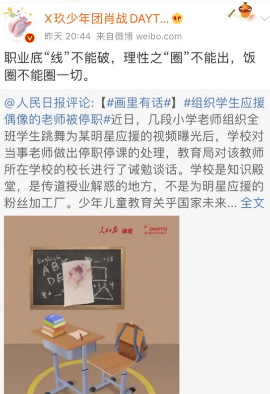 发布此段言论,是因为有粉丝,为了表示对肖战的支持,错误利用自己的教师身份,让班级同学一起来应援肖战。虽然粉丝的初心是好的,但是却用了错误的方式。我们不能要求老师们清心寡欲,但在合适的环境、对合适的对象、做合适的事,这原本就是成年人最基本的常识。教师利用自己职业身份的表现,试图达到超出范畴的影响,这本身就是值得商榷的。此事件爆发后,影响力堪比227事件,就是粉丝这一“无心之举”,肖战又一次被推上风口浪尖。