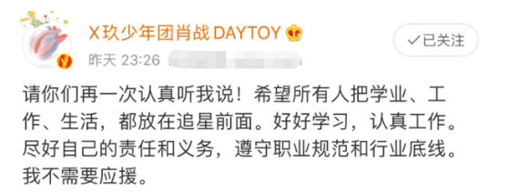 肖战10日晚上11点多发微博声明:请你们再一次认真听我说!希望所有人把学业、工作、生活,都放在追星前面。好好学习,认真工作。尽好自己的责任和义务,遵守职业规范和行业底线。我不需要应援。