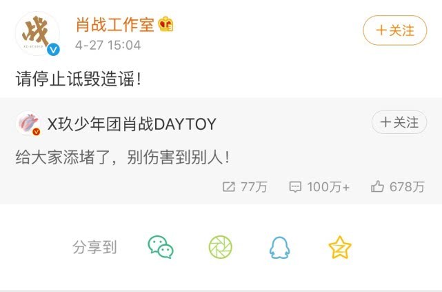 4月27日,肖战终于回应道:“给大家添堵了,别伤害别人!”肖战工作室也转发了这条微博,并且呼吁“请停止诋毁造谣!”