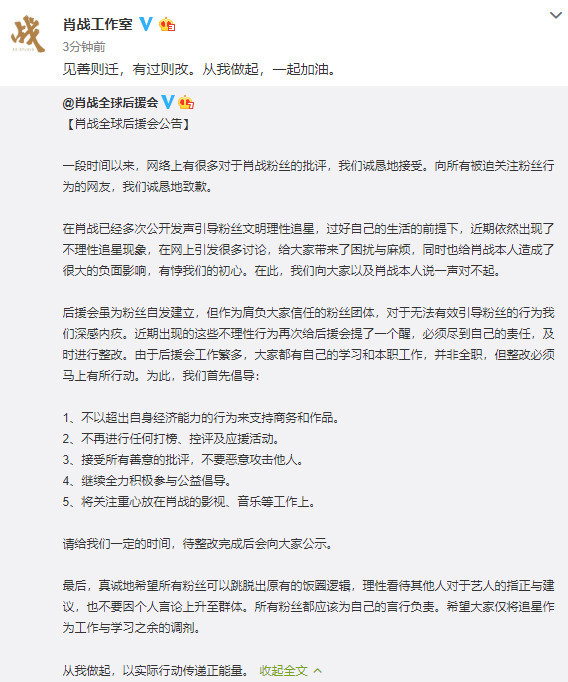 后援会公告中对粉丝提出了五点整改倡议: