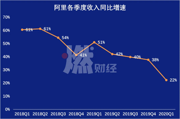 一季度收入1143亿元,比去年同期增长22%。22%的增速是什么概念?不算低,但却是阿里上市后季度最差。至少在过去连续的10个季度里,这个数字从来没有低于35%。