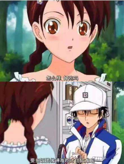 最后再来看一下网球王子,人家女生请你吃饭团,你竟然来一句做得难吃才比较难?你让我家附近卖饭团的怎么好意思啊,我上次买的饭团味道就不怎么样,果然从国外回来的龙马就是不一样啊!