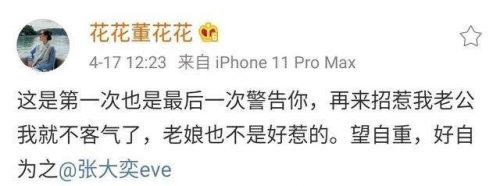 多名拥有百万粉丝的微博大V转发“花花董花花”的微博跟进此事,但,瓜还没吃完,原微博很快就被删除。紧接着,该条微博的评论和转发功能均呈现灰色,无法再被评论和转发。“张大奕eve”则是将新发的微博关闭了评论。
