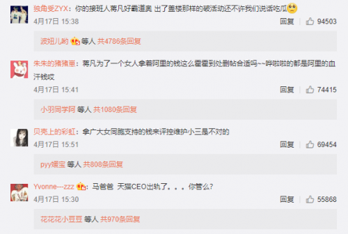 4月18日下午,蒋凡迅速在阿里内网进行回应:称自己因为家人在微博上的言论和一些网上传言给公司带来了非常不好的影响,我在这向大家深表歉意”。