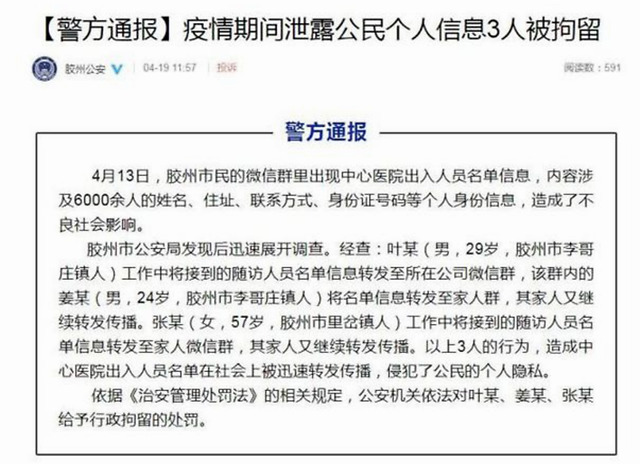 @中新网 中新网4月19日消息,据山东胶州市公安局官方微博消息,4月13日,胶州市民的微信群里出现中心医院出入人员名单信息,内容涉及6000余人的姓名、住址、联系方式、身份证号码等个人身份信息,造成了不良社会影响。
