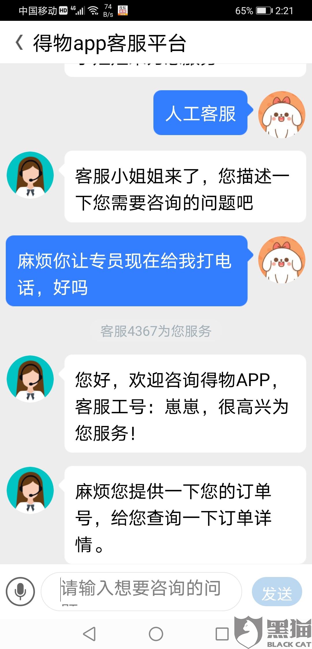 商家“得物App客户服务”4月23日在黑猫投诉平台回复:“您好,已帮您转交人工客服,还请耐心等待021开头客服回电 ”