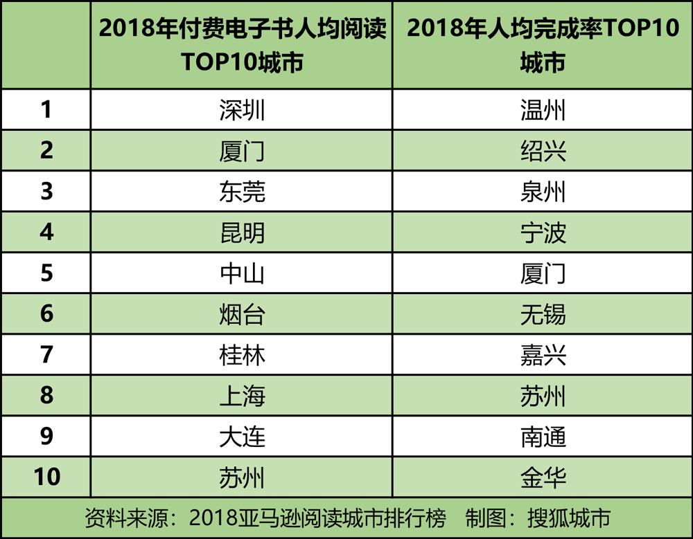 除此之外,还有一个非常有趣的榜单。在2018年亚马逊统计的阅读城市排行榜上,深圳在付费电子书人均阅读中位列第一,一线新一线城市中的东莞、昆明、上海和苏州跻身前十。但在付费电子书人均完成率排名中,一线新一线城市里却只有宁波、苏州进入前十。也就是说,有一大部分人买完书之后并不会读完。