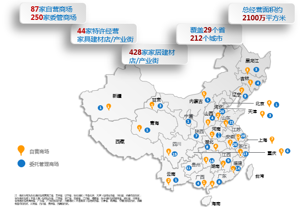 红星美凯龙经营的自营商场和委管商场覆盖全国212个城市,商场经营面积达到2100万平方米,商场出租率高达93.5%。公司通过自营商场与委管商场双轮驱动的发展模式占领了一线城市、二线城市核心区域的物业,同时积累了丰富的商场营运经验,不断提升品牌价值,并构建了较高的进入壁垒。