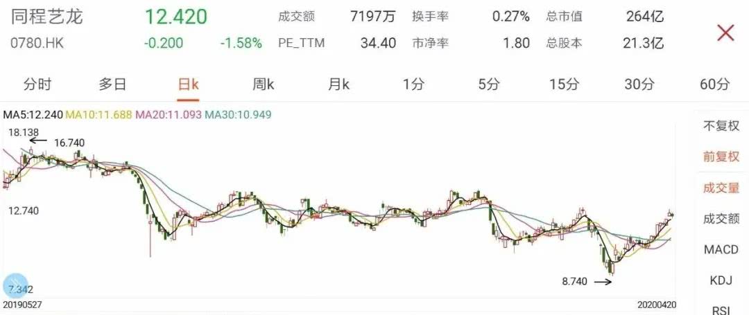 受到上述传言影响,港股上市公司同程艺龙今日下跌1.58%,报收12.42港元,总市值为264.49亿港元。