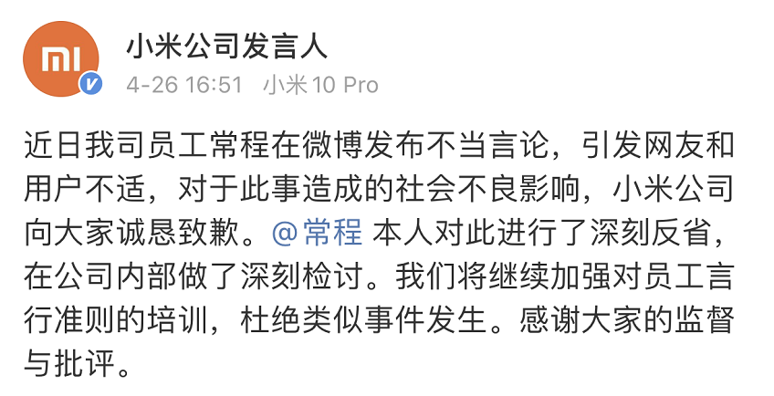 同时提到,常程本人对此进行了深刻反省,在公司内部做了深刻检讨。小米将继续加强对员工言行准则的培训,杜绝类似事件发生。