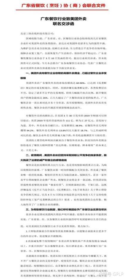 交涉函中提出,美团外卖在广东餐饮外卖的市场份额高达60%―90%,已达到《反垄断法》规定的市场支配地位。同时,美团外卖向餐饮企业收取高额外卖佣金,对新开发已超过餐饮企业承受限度。