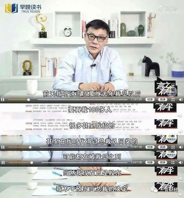 此前,李国庆在视频节目《言之有李》中谈及疫情中的裁员现象时透露,“听说当当要继去年裁员以后,要再裁100多人,很多甚至我招的,甚至在我时代得过总裁认同奖,可能都在被裁员之列。”