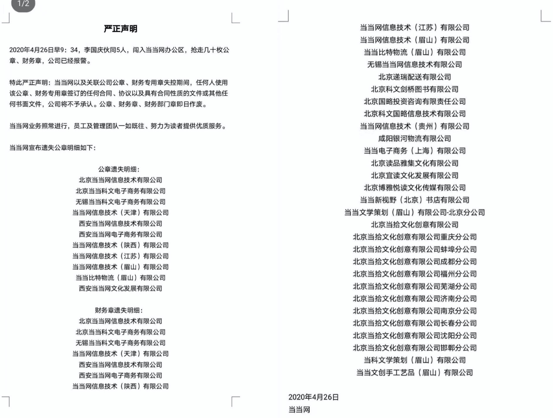 当当网亦在当天下午发布声明,正面回应确认李国庆伙同5人,闯入当当网办公区,抢走几十枚公章、财务章。并称公司已经报警,同时,公章、财务章、财务部门章即日作废。