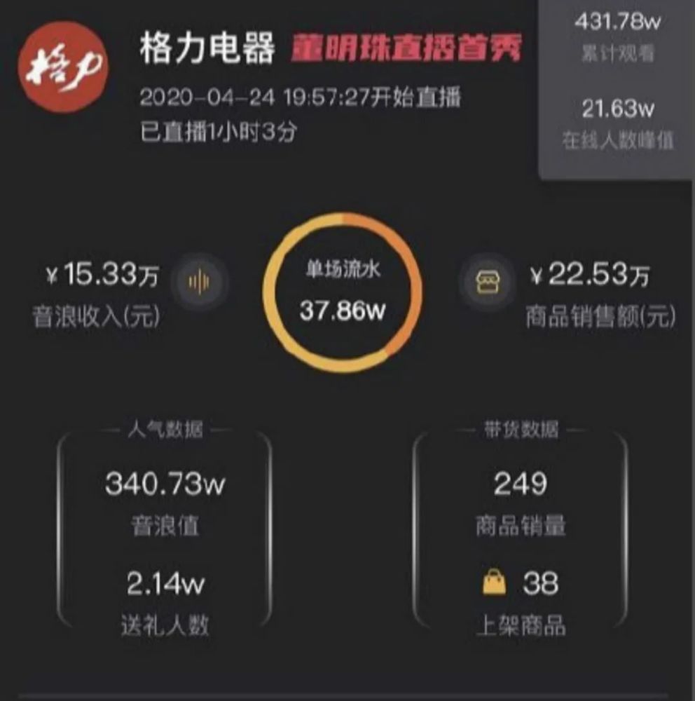 格力董事长董明珠举行了自己的直播首秀,在这之前相信有很多人都认为她会像罗永浩一样首秀将大获成功,无奈事实刚好相悖。整场直播结束后,我们可以看到实际销售额才20多万,这与罗永浩直播首秀收获的一亿多销售额相比简直就是九牛一毛。