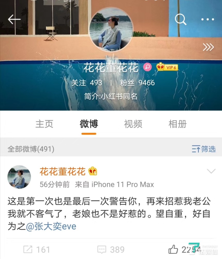 4月17日,微博ID为“花花董花花”的博主发声手撕当红网红张大奕, “这是我第一次也是最后一次警告你,再来招惹我老公我就不客气了,老娘也不是好惹的。望自重,好自为之,同时@张大奕eve”。据多家媒体报道,“花花董花花”系蒋凡夫人。