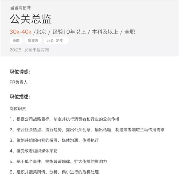 遭遇李国庆突袭之后,26日下午,当当网在招聘网站紧急招聘公关总监,职责包括处理企业危机公关,将企业的形象及声誉损失降至最低,薪资为3万-5万。