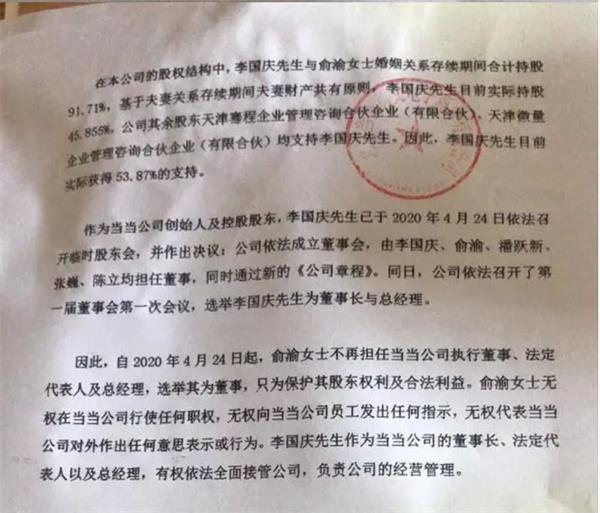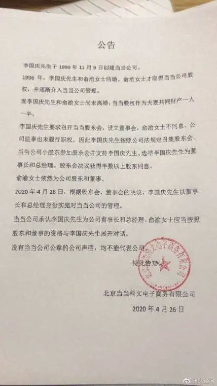 该公告称,“李国庆于1999年11月9日创建当当公司。1996年,李国庆和俞渝结婚。俞渝才取得当当公司股权,并逐渐介入当当公司管理。现李国庆和俞渝尚未离婚,当当股权作为夫妻共同财产一人一半。”